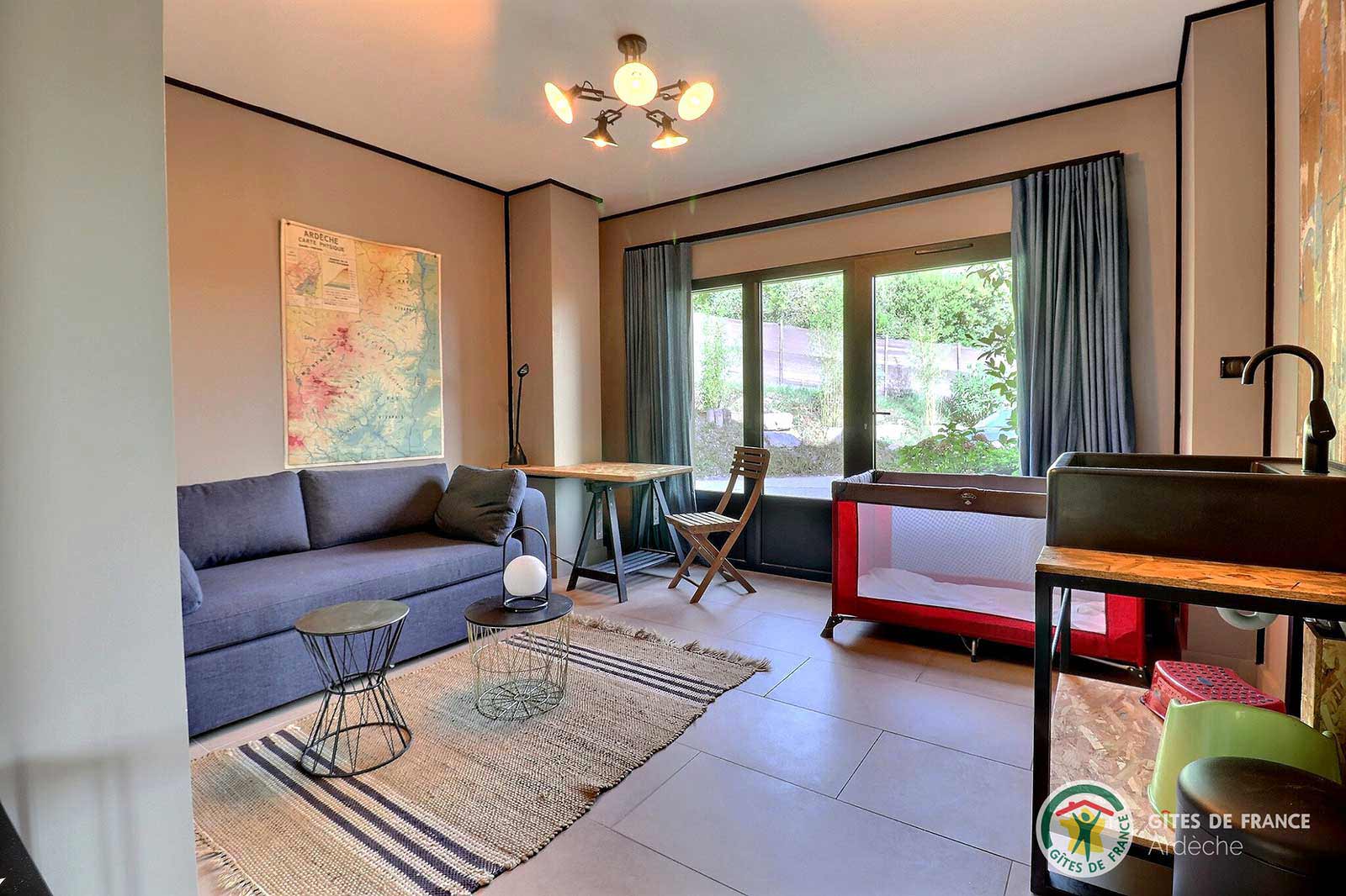 Avec une pièce de vie ouverte avec salon (canapé incluant 2 couchages enfants) et cuisine équipée (lorsque le studio est désolidarisé).