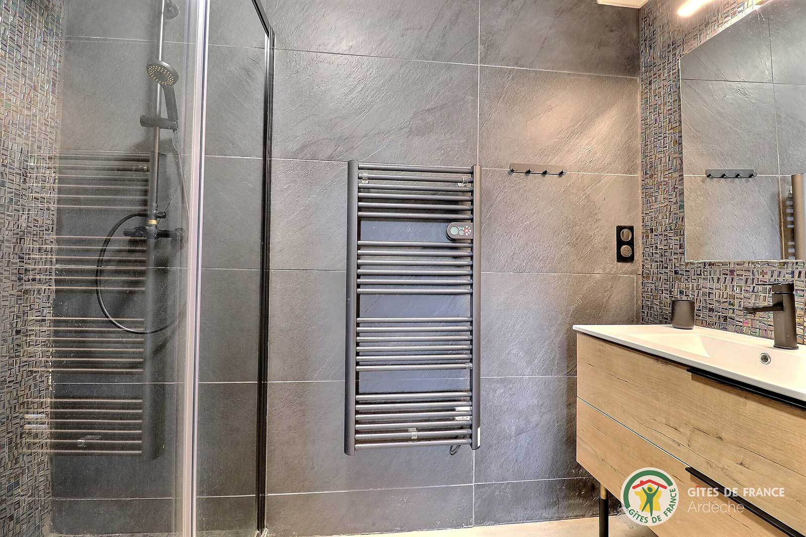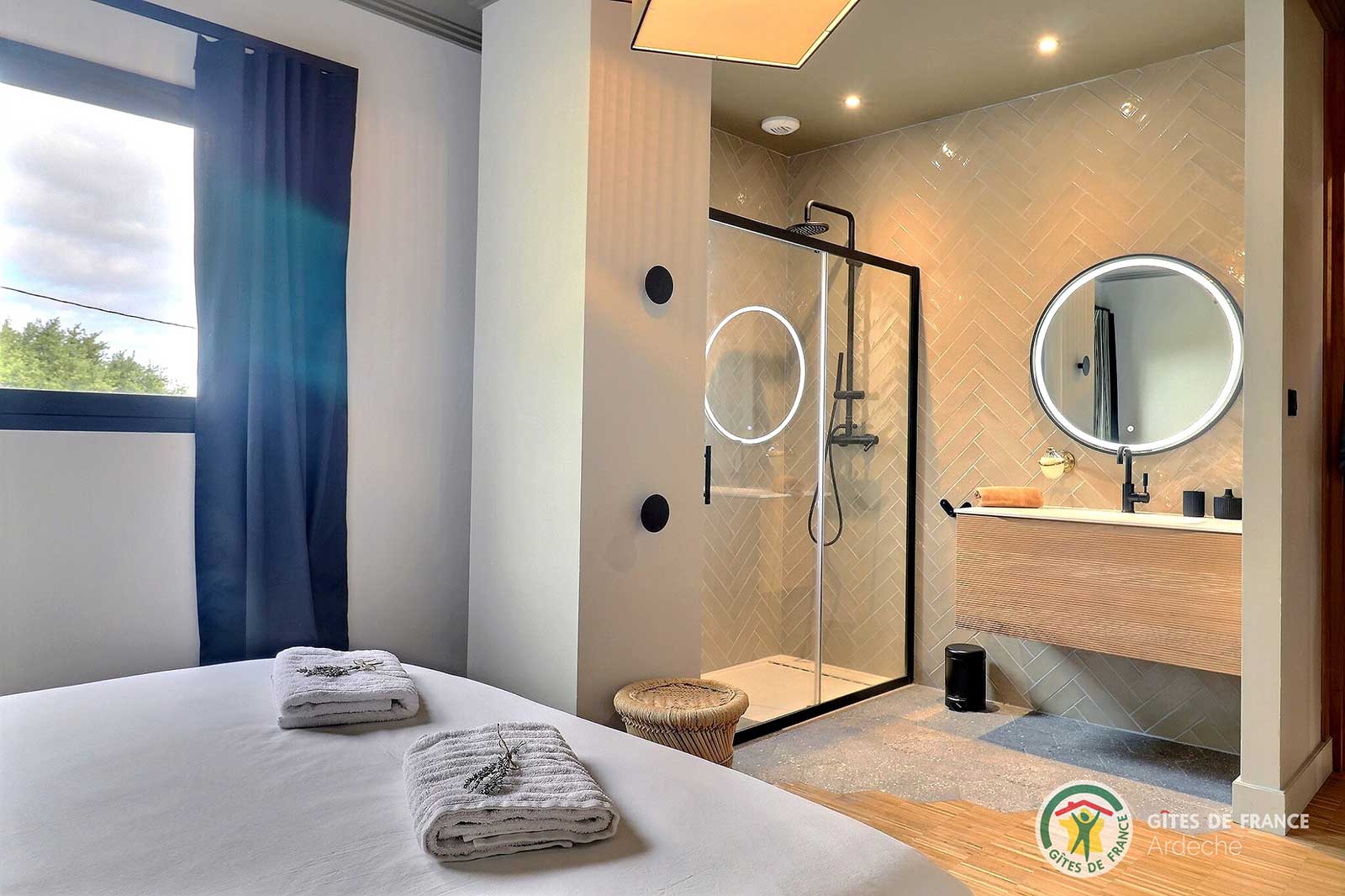 Chambre beige : lit en 160 et salle de bain avec douche italienne privative.