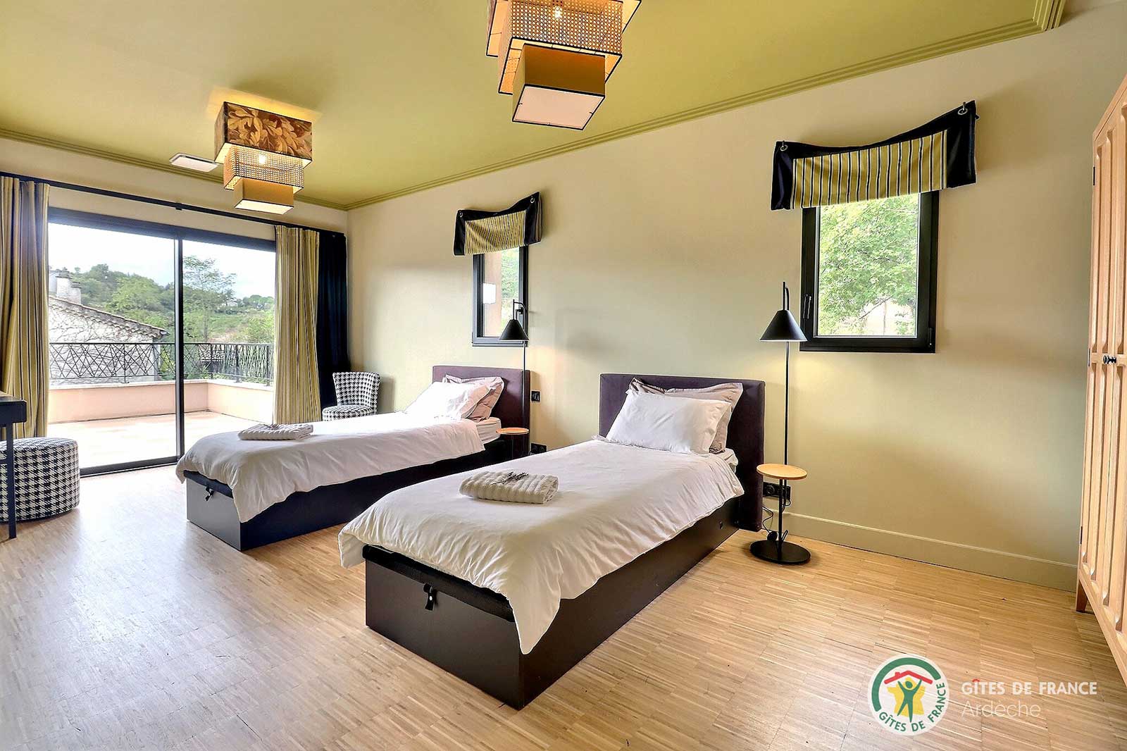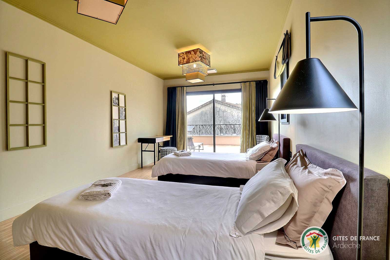 Chambre deux lits doubles : 2 lits en 90, terrasse privative et douche italienne et toilette sur l’espace commun.
