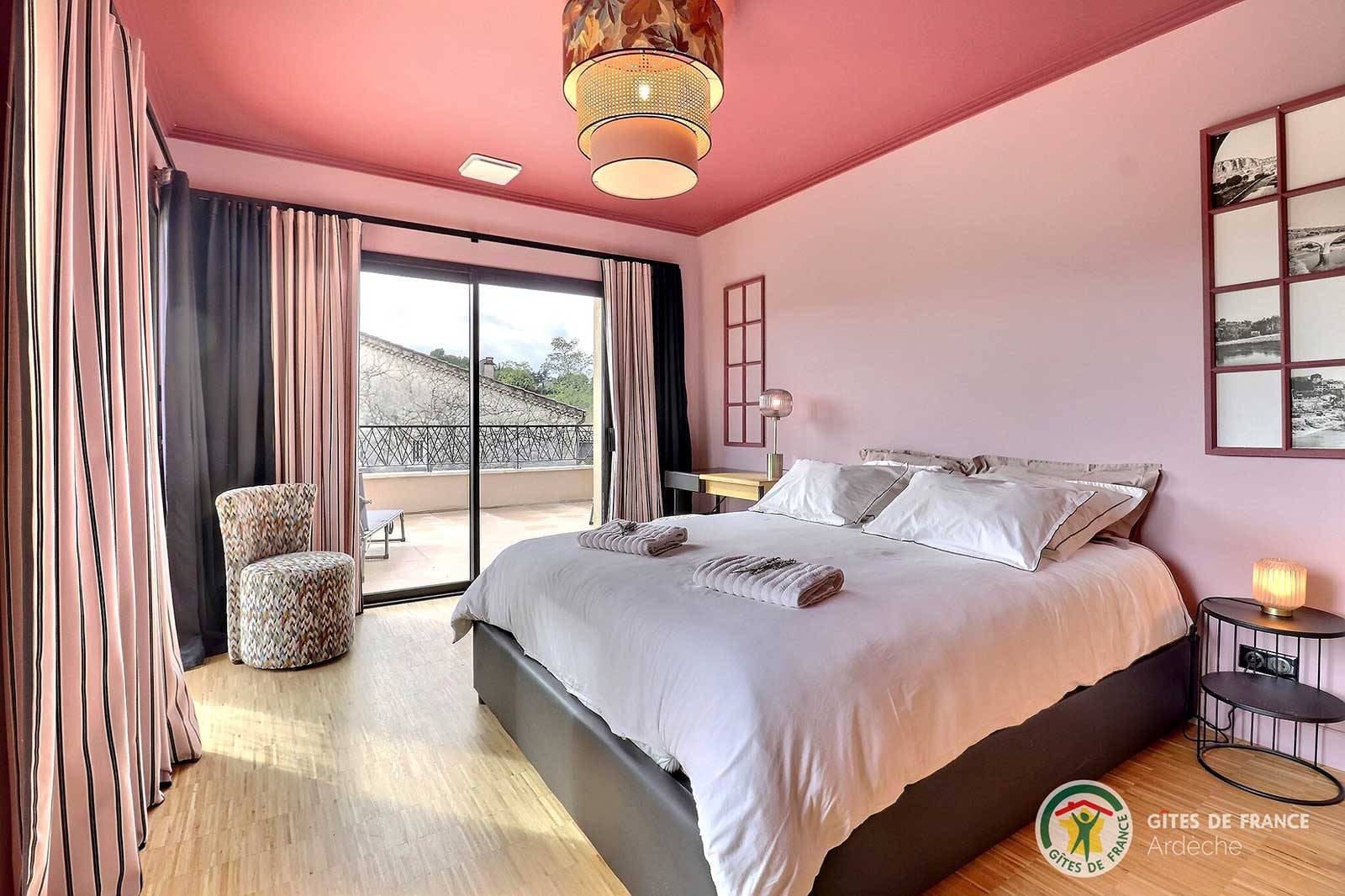 Chambre rose : lit en 160, terrasse privative et douche italienne et toilettes sur l’espace commun.