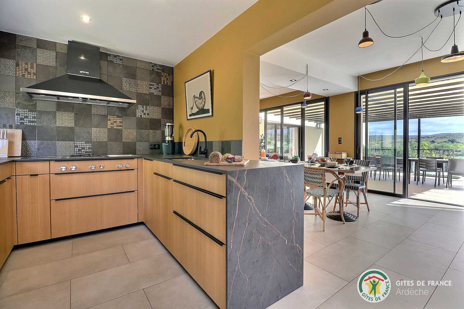 La cuisine est ouverte et entièrement équipée : micro-ondes, four haute technologie, plaque de cuisson gaz et induction et plaque « TeppanYaki » (plancha japonaise), lave-vaisselle, un réfrigérateur américain avec coffre congélateur, un second réfrigérateur avec congélateur, machine à café expresso, bouilloire, grille pain, cuit vapeur, et autres ustensiles de cuisine.