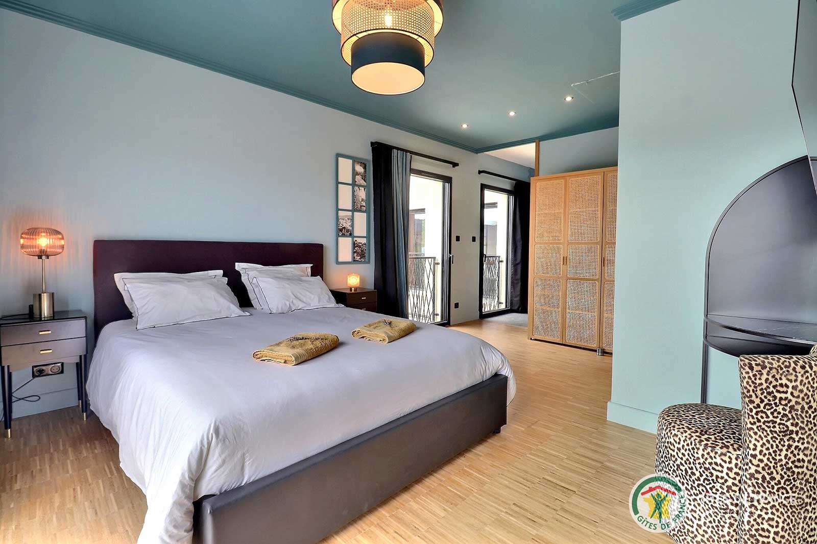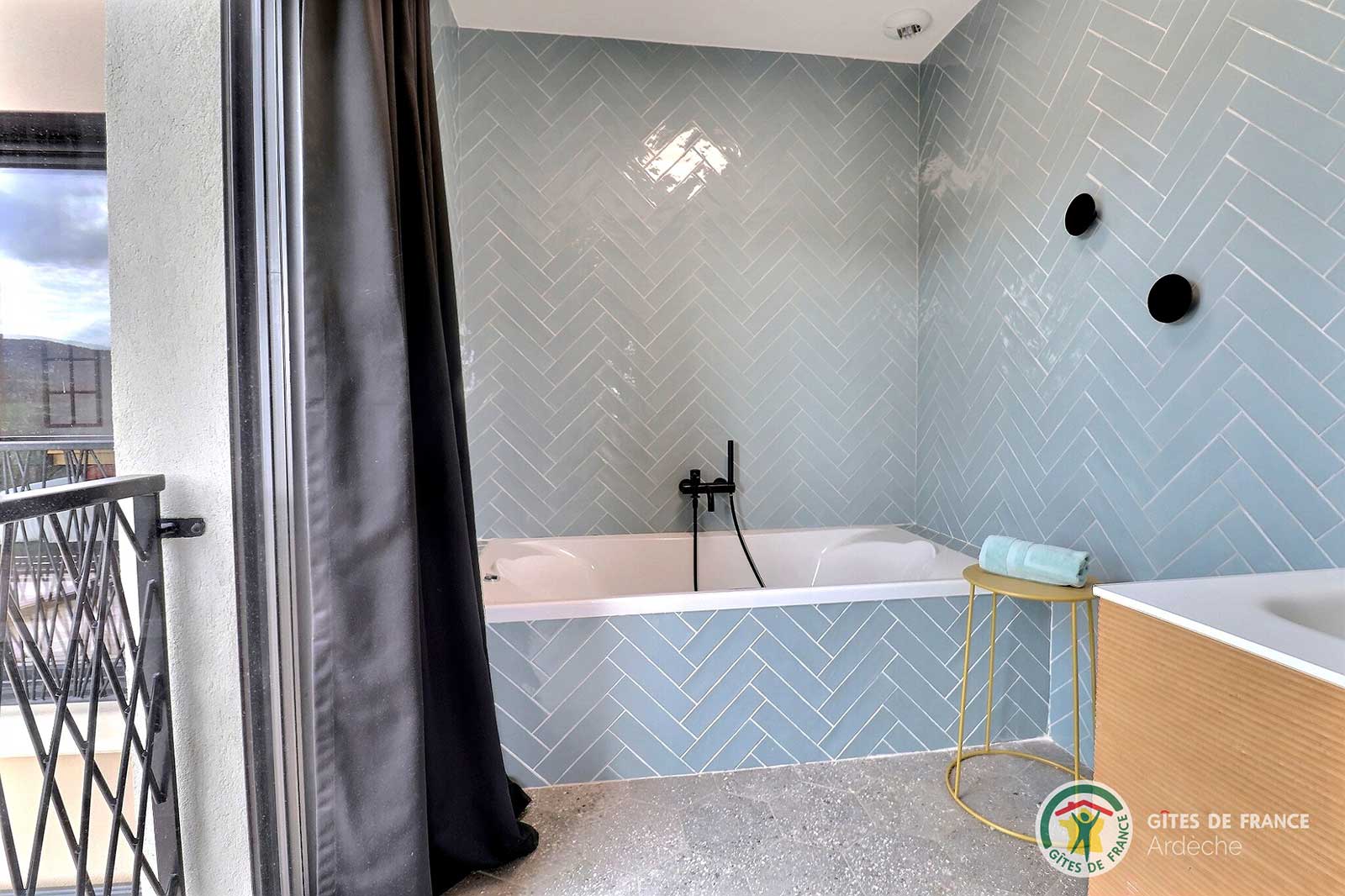 Suite parentale bleue : lit en 160, salle de bain avec baignoire, toilettes et terrasse.